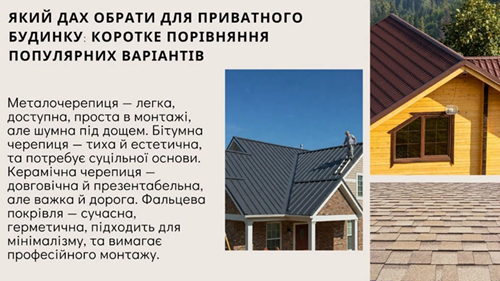 Вибір даху для приватного будинку – одне з найважливіших рішень, яке впливає на довговічність, зовнішній вигляд і комфорт життя в оселі. Різні матеріали мають свої переваги та недоліки, тому важливо оцінювати їх комплексно.